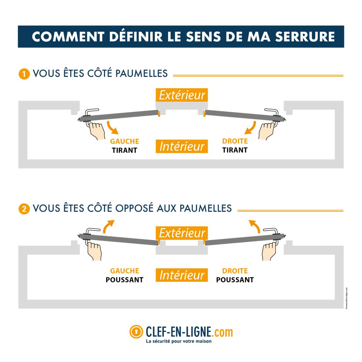Si vous devez tirer la porte vers la droite pour l’ouvrir, alors le sens de la serrure est tirant à gauche.
