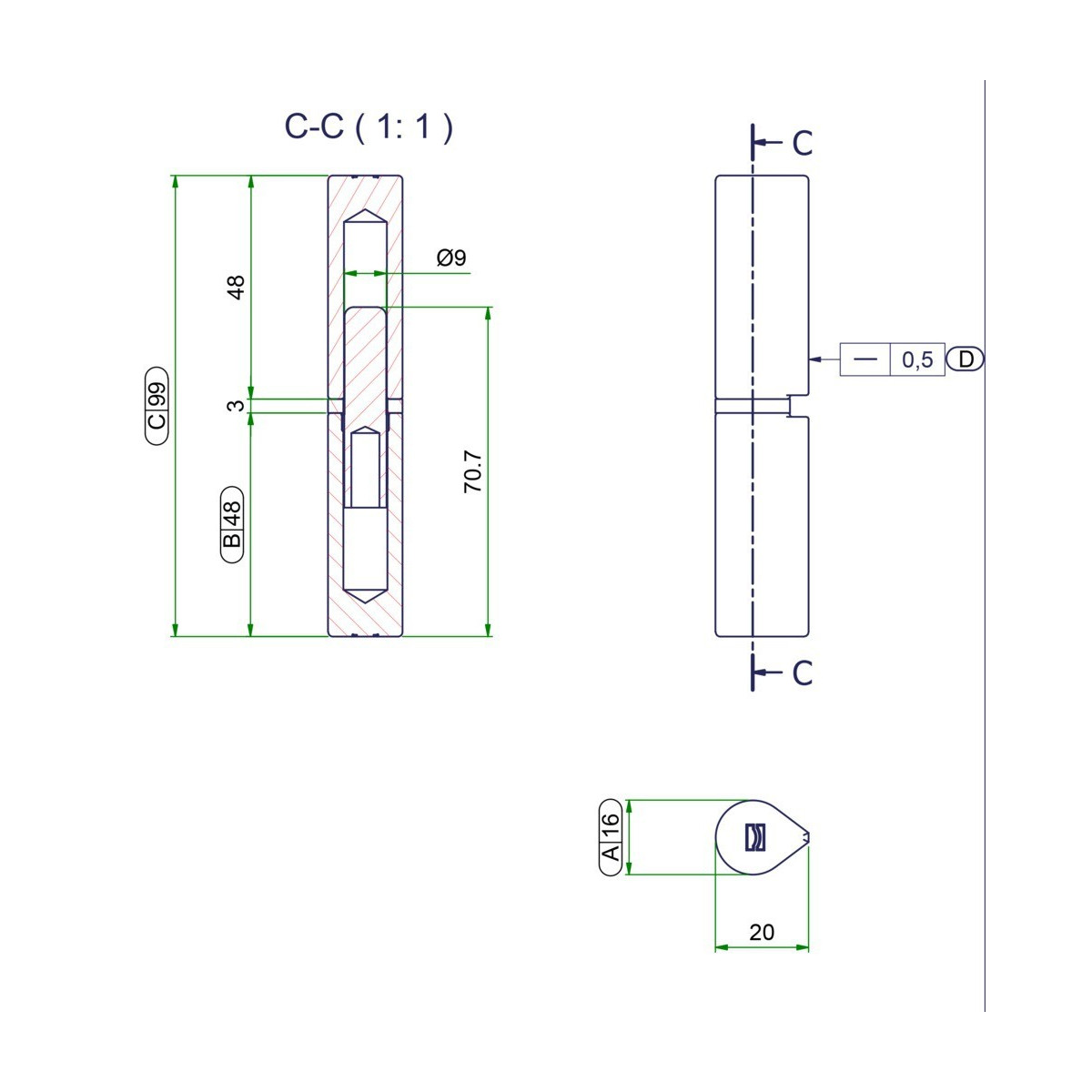 Charnière à goutte façonnée au tour avec axe en acier et rondelle. Entrée de gamme.
